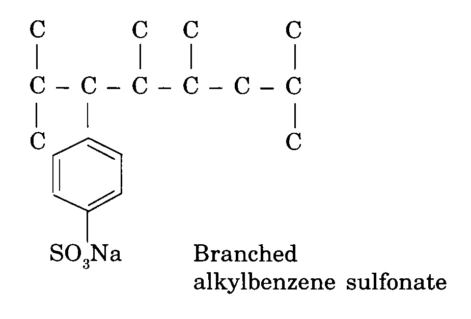 Alkylbenzene sulfonate is attacked by microorganisms through the alkyl chain, not through the sulfonate group or the benzene ring (Nielsen et al., 1985). In the case of BAS, the alkyl chain is resistant to microbial attack due to the highiy branch hydrocarbon chains. Microorganisms are deficient of enzyme systems that can attack and biodegrade such highly branched alkyl chains when they are attached to a benzene ring, thus posing problems in the biodegradation of BAS. BAS began to be noticeable in waste waters, treated sewage and receiving waters because they retained their foaming properties in natural waters at concentrations around 1 ppm (Swisher, 1987). However, certain bacteria are able to degrade BAS up to 60% during the primary and secondary treatment processes. However this degradation is slow and consequently, measureable amounts (ppm) are present in treatment plant effluents and these normally enter water systems. In other words, BAS does not undergo complete biodegradation and persists in the environment.